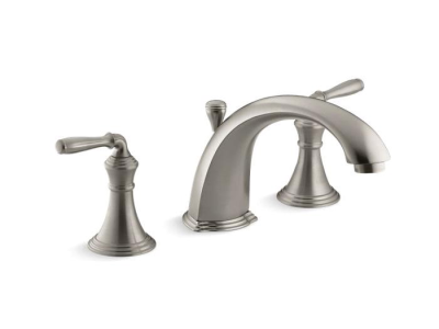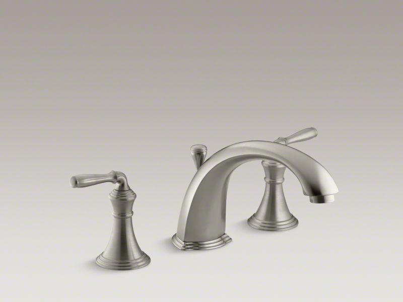 Kohler® Bath Tub Faucet Trim, Devonshire®, 12 gpm, 8 in Center Distance, Diverter Spout, 8-15/16 in Spout Reach, 4-1/2 in Spout Height, Lever, 2 Handles, 3 Faucet Holes, Function: Traditional, Hand Shower Yes/No: No, 2-1/2 in Maximum Deck Thickness, Deck Mount, 8-15/16 in L x 6-13/16 in W, Brass, Vibrant® Brushed Nickel