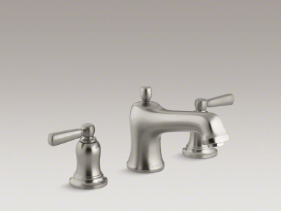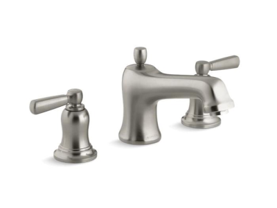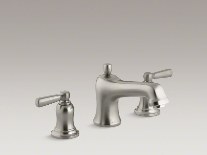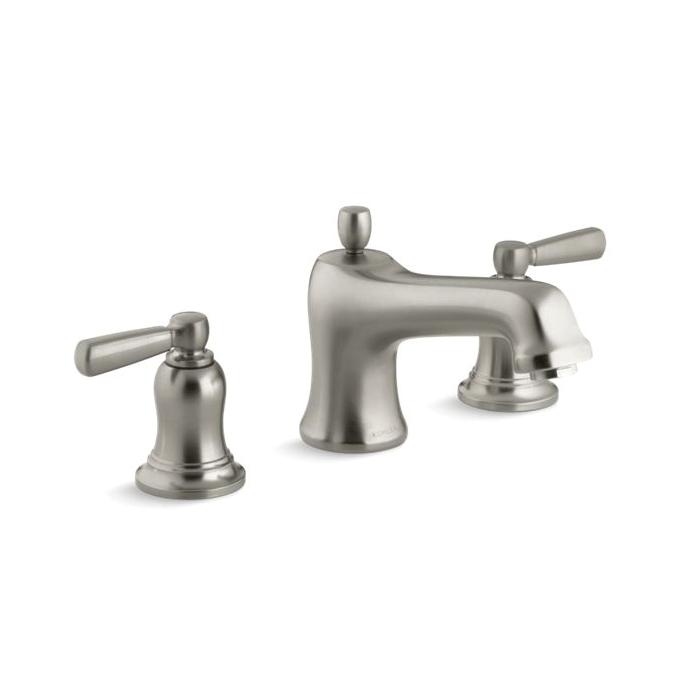 Kohler® Bath Tub Faucet Trim, Bancroft®, 16 gpm, 8 in Center Distance, Non-Diverter Spout, 7-3/16 in Spout Reach, 3-7/16 in Spout Height, Metal Lever, 2 Handles, 3 Faucet Holes, Slip-Fit, Function: Traditional, Hand Shower Yes/No: No, 2-1/8 in Maximum Deck Thickness, Deck/Bath Mount, Ceramic Disc Valve/Cartridge, 7-3/16 in L x 8 in W x 6 in H, Solid Brass, Vibrant® Brushed Nickel