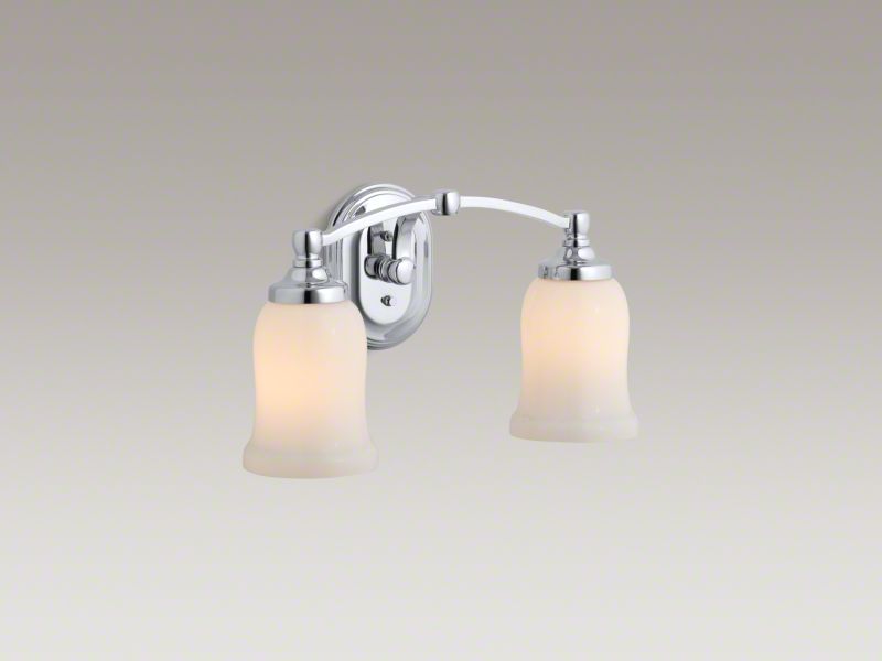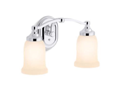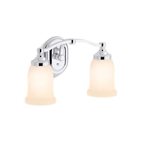 Kohler®, 11422-CPL, Light Sconce, Series: 11422, Bancroft® Collection, CFL Lamp, 60 W Lamp, E26 Medium Lamp Base, 2 Lamps, Frost Glass Shade, Wall Mounting, Metal Housing Material, Polished Chrome Housing Finish, 15-1/6 in L x 6-7/8 in W x 8-11/16 in H Dimensions
