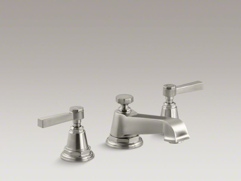 Featuring elements of vintage 1930s American design, the KOHLER® Pinstripe Pure bathroom sink faucet lends a sense of relaxed luxury to your bath or powder room. The classic lever handles and angular widespread bathroom sink faucet spout bring a seamless balance of geometric forms and symmetrical lines. This faucet is outfitted with easy-to-install, leak-free UltraGlide® valves for excellent performance.