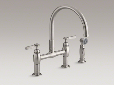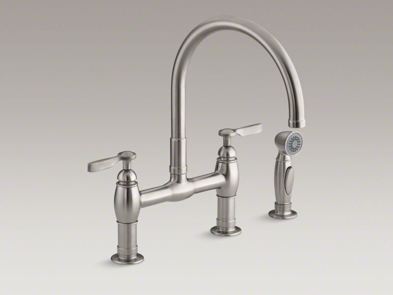 This Parq kitchen faucet delivers a fresh interpretation of the traditional bridge design, incorporating clean lines for ease of maintenance. The high-arch gooseneck swing spout provides generous clearance over pots and pans, while the separate sidespray pulls down into the sink for easier cleaning and up-close tasks.