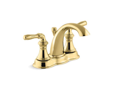 Kohler® Centerset Bathroom Sink Faucet, Devonshire®, 1.2 gpm, 4 in Center Distance, High-Arc Spout, 4-3/4 in Spout Reach, 4 in Spout Height, Lever, 2 Handles, Pop-Up Drain, 3 Faucet Holes, 1-1/2 in Maximum Deck Thickness, Deck Mount, Ceramic Disc Valve/Cartridge, 6-3/8 in W x 5-1/8 in H, Premium Metal, Vibrant® Polished Brass