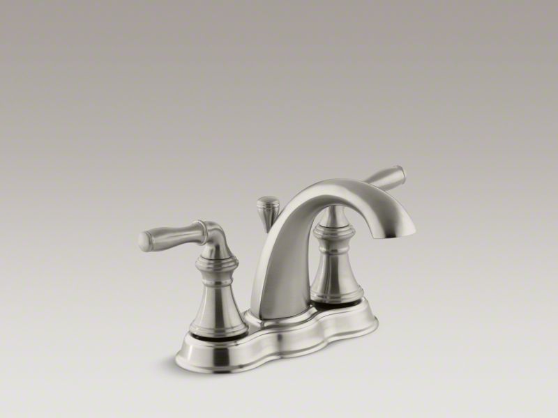 Kohler® Centerset Bathroom Sink Faucet, Devonshire®, 1.2 gpm, 4 in Center Distance, High-Arc Spout, 4-3/4 in Spout Reach, 4 in Spout Height, Lever, 2 Handles, Pop-Up Drain, 3 Faucet Holes, 1-1/2 in Maximum Deck Thickness, Deck Mount, Ceramic Disc Valve/Cartridge, 6-3/8 in W x 5-1/8 in H, Premium Metal, Vibrant® Brushed Nickel