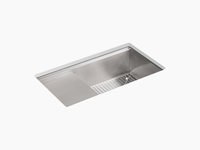 Designed in collaboration with the chefs at Kohler's Five Diamond resort hotel, Stages meets the needs of the serious home cook. The Stages sink comes with a full array of integrated accessories to simplify the cooking and cleanup processes. The design offers a wide basin to accommodate large pots and pans, as well as a stepped side platform for prepping food or drying dishes. Handcrafted from premium quality, 16-gauge stainless steel, Stages features an engineered sound-absorption system that significantly reduces disposal and dishwashing noise.