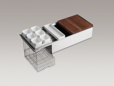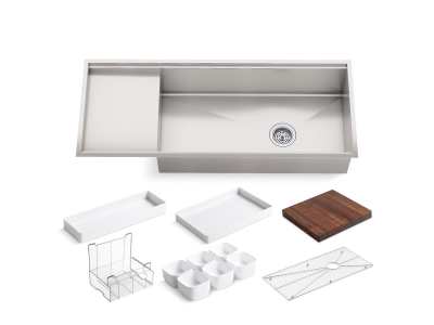 Designed in collaboration with the chefs at Kohler's Five Diamond resort hotel, KOHLER® Stages meets the needs of the serious home cook. The Stages undermount kitchen sink comes with a full array of integrated accessories to simplify the cooking and cleanup processes. The design offers a wide basin to accommodate large pots and pans, as well as a stepped side platform for prepping food or drying dishes. Handcrafted from premium quality, 16-gauge stainless steel, Stages features an engineered sound-absorption system that significantly reduces disposal and dishwashing noise.