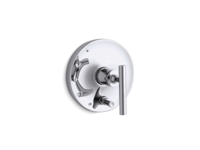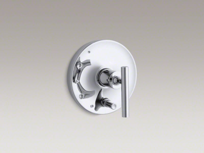 KOHLER® Purist faucets and accessories combine simple, architectural forms with sensual design lines. Featuring this modern, minimalist style, this Purist valve trim brings sophistication to your shower with its bold shape and single lever handle. The trim features a convenient push-button diverter, which smoothly transitions water from the showerhead to a bath spout. Pair this trim with a Rite-Temp® pressure-balancing valve with push-button diverter, which maintains your desired water temperature during pressure fluctuations.