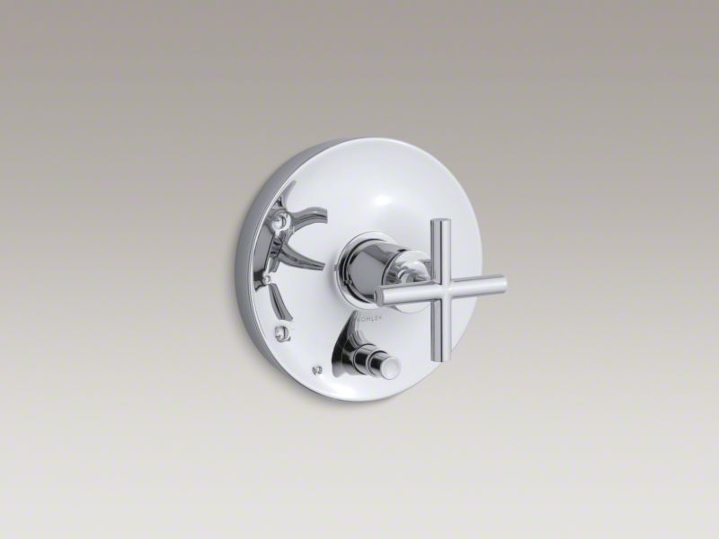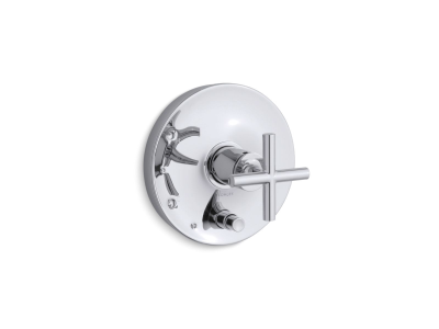 KOHLER® Purist faucets and accessories combine simple, architectural forms with sensual design lines. Featuring this modern, minimalist style, this Purist valve trim brings sophistication to your shower with its bold shape and single cross handle. The trim features a convenient push-button diverter, which smoothly transitions water from the showerhead to a bath spout. Pair this trim with a Rite-Temp® pressure-balancing valve with push-button diverter, which maintains your desired water temperature during pressure fluctuations.