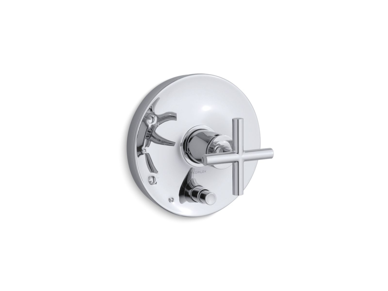 Kohler® Valve Trim, Purist® Rite-Temp®, Pushbutton Diverter Spout, 1 Handles, Cross, 6-1/2 in Dia Trim, Pressure Balanced Valve/Cartridge, Hand Shower Yes/No: No, Wall Mount, Metal, Polished Chrome