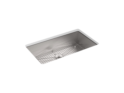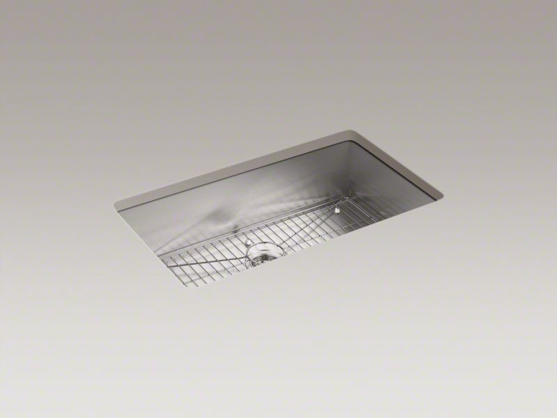 The distinctive, modern design of the KOHLER® Vault dual-mount sink lends a contemporary vibe to your kitchen. This spacious single bowl, handcrafted from durable stainless steel, is ideal for soaking and washing large pans. It features tightly angled corners to maximize basin space and a sloped bottom that helps with draining and cleanup. An engineered sound-absorption system significantly reduces disposal and dishwashing noise. Vault's ultra-flat rim makes it easy to wipe from the counter directly into the 33" top-/undermount single-bowl kitchen sink .