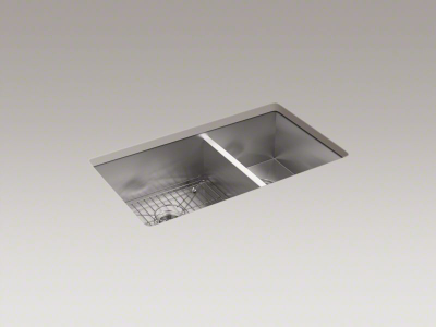 The distinctive, modern design of the Vault dual-mount sink lends a contemporary vibe to your kitchen. Handcrafted from durable stainless steel, the large/medium bowls allow you to keep clean and dirty dishes separate while offering plenty of room for oversize pots and pans. The sink features tightly angled corners to maximize basin space and a sloped bottom that helps with draining and cleanup. A slightly lowered divide in between the basins helps prevent water from flowing into the countertop.