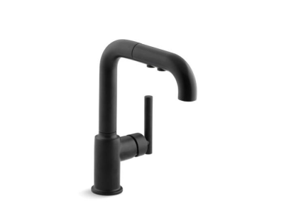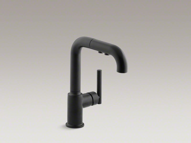 Kohler® Kitchen Sink Faucet, Purist® Collection, 1.8 gpm Flow Rate, High-Arc Swivel Spout, 7 in Spout Reach, 9-7/8 in Spout Height, Lever Handle, 1 Handles, Side Spray(Y/N): No, 1 Faucet Holes, 3/8 in Connection, Compression Connection, Spray Pattern: Pull Out, 3 Spray Functions, 2-1/2 in Maximum Deck Thickness, Deck Mounting, Ceramic Disc, Metal, Matte Black