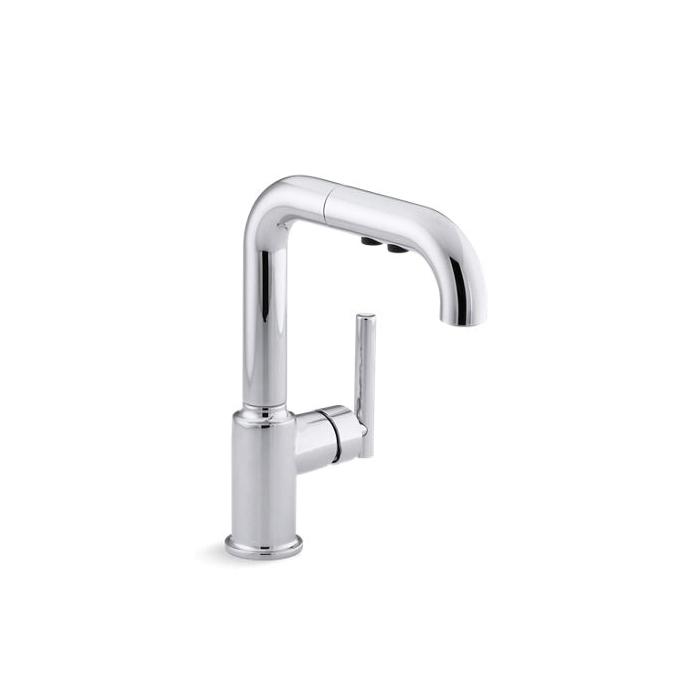 Kohler® Kitchen Sink Faucet, Purist® Collection, 1.8 gpm Flow Rate, High-Arc Swivel Spout, 7 in Spout Reach, 9-7/8 in Spout Height, Lever Handle, 1 Handles, Side Spray(Y/N): No, 1 Faucet Holes, 3/8 in Connection, Compression Connection, Spray Pattern: Pull Out, 3 Spray Functions, 3-1/4 in Maximum Deck Thickness, Deck Mounting, Ceramic Disc, 7 in L x 2 in W x 9-7/8 in H, Metal, Polished Chrome