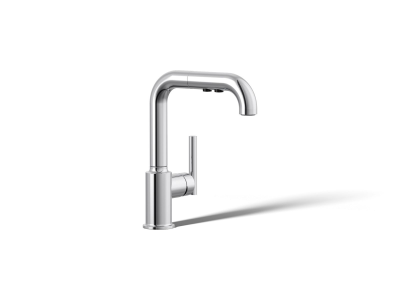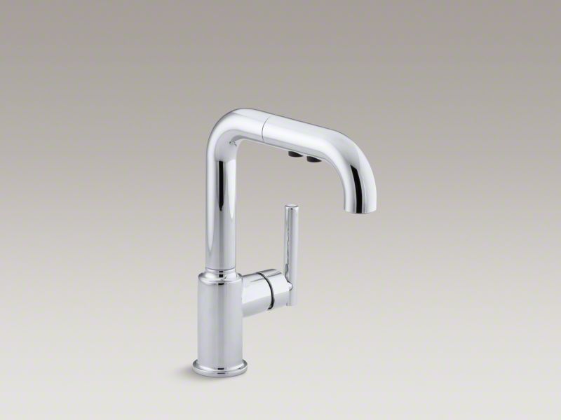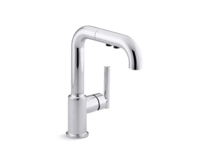 Designed to accommodate an extra-thick counter, this KOHLER® Purist bar or prep sink faucet combines a strong architectural form and simple-to-use features. Featuring a single lever handle, the high-arch swing deck-mount kitchen faucet spout includes a pull-out sprayhead with two flow options and pause function to make kitchen tasks easier. This faucet is ideal for an entertainment area, kitchen island, or prep sink.