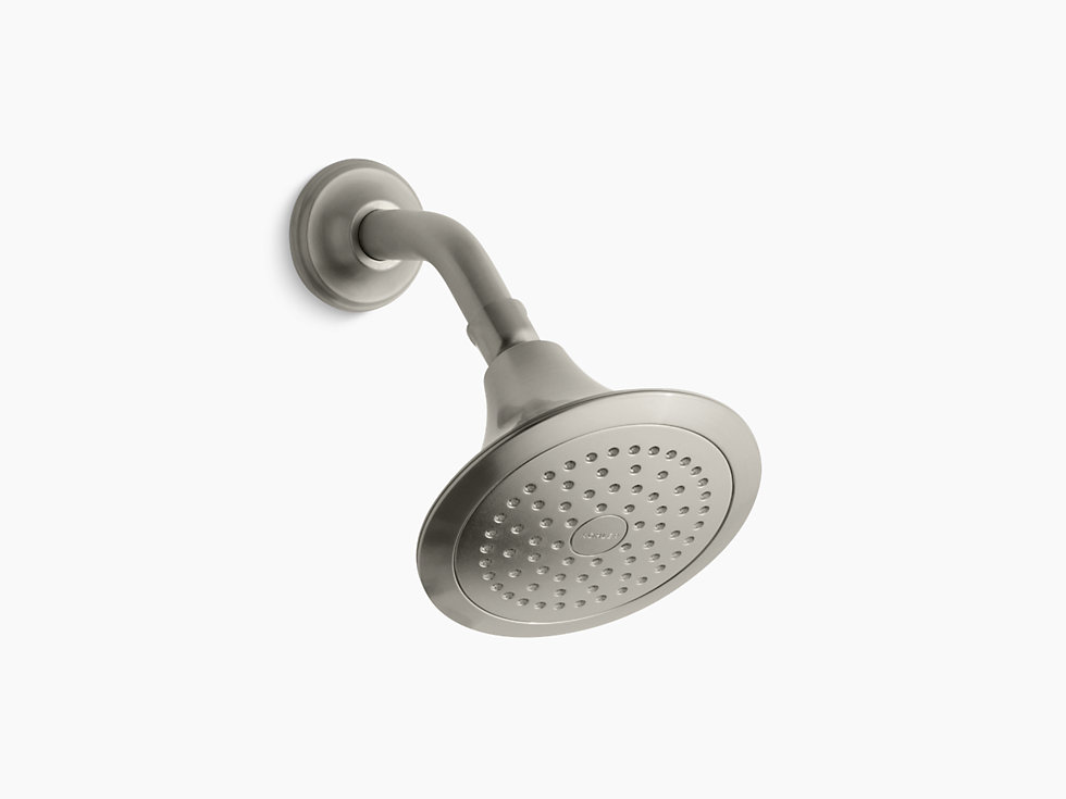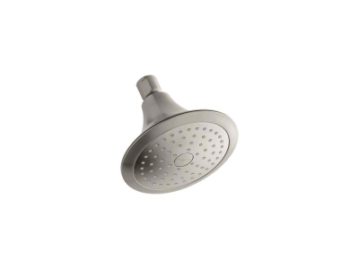 Kohler® Showerhead, Single Function, Forte®, 2.5 gpm Minimum Flow Rate, 1/2-14 NPT, Round, Number of Sprays: 1, Spray Pattern: Full Body, Wall Mount, 5-1/2 in Dia x 4-5/8 in H Head, 5-1/2 in Overall Length, 5-1/2 in Overall Width, 4-5/8 in Overall Height, Brass, Vibrant® Brushed Nickel