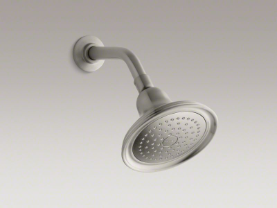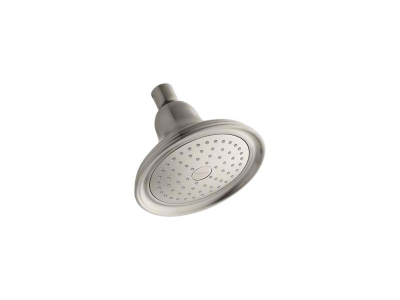Kohler® Shower Head, Single Function, Devonshire®, 2.5 gpm Minimum Flow Rate, 1/2 in NPT, Round, Number of Sprays: 1, Spray Pattern: Full Body, Wall Mount, 5-15/16 in Overall Length, 5-15/16 in Overall Width, 4-5/8 in Overall Height, Brass, Vibrant® Brushed Nickel