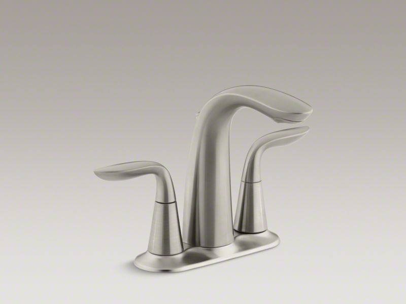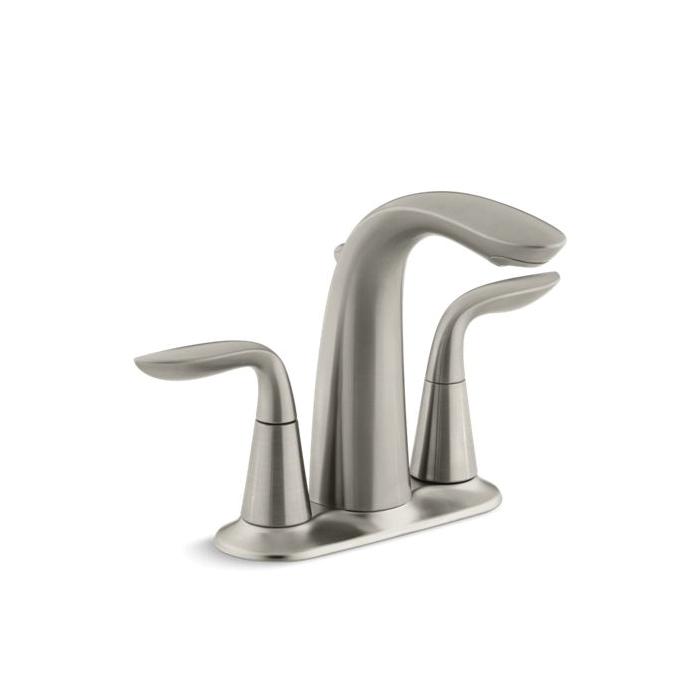 Kohler® Centerset Bathroom Sink Faucet, Refinia®, 1.2 gpm, 4 in Center Distance, 4-1/2 in Spout Reach, 5-15/16 in Spout Height, Lever, 2 Handles, Pop-Up Drain, 3 Faucet Holes, 3/8 in, Compression, 1-1/2 in Maximum Deck Thickness, Ceramic Disc Valve/Cartridge, 6-3/4 in H, Metal, Vibrant® Brushed Nickel