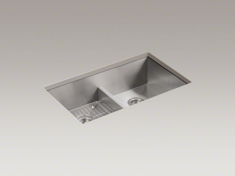 The distinctive, modern design of the KOHLER® Vault dual-mount sink lends a contemporary vibe to your kitchen. Handcrafted from stainless steel, this sink features tightly angled corners to maximize bowl space and a lowered divider for freedom of movement between bowls. When installed as a top-mount sink, Vault offers a low-profile rim that makes it easier to wipe from the countertop directly into the bowl. An optional bottom sink rack is available that fits in either bowl to help prevent scratches.