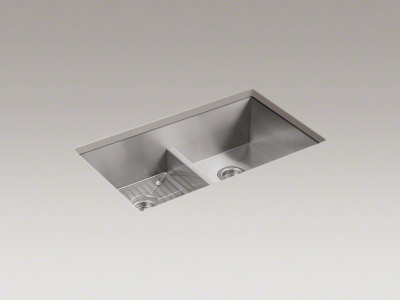 Kohler®, 3838-1-NA, Kitchen Sink, Vault™ Collection, Rectangular Shape, 14-9/16 in L x 16-9/16 in W x 9 in H Bowl, 3-5/8 in Drain Opening, 1 Faucet Holes, 2 Basins, 33 in W x 9-5/16 in D x 22 in H Overall, Top/Undermount Mounting, Stainless Steel