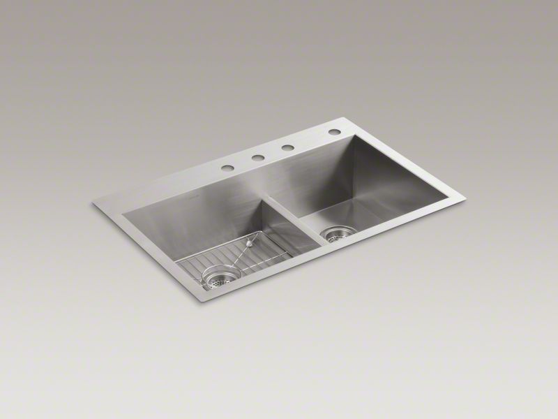 Kohler®, 3839-4-NA, Kitchen Sink, Vault™ Collection, Rectangular Shape, 17-1/2 in L x 16-9/16 in W x 9 in H Left, 11-1/2 in L x 16-9/16 in W x 9 in H Right Bowl, 3-5/8 in Drain Opening, 4 Faucet Holes, 4 in Faucet Hole Spacing, 2 Basins, 33 in W x 9-5/16 in D x 22 in H Overall, Top/Undermount Mounting, Stainless Steel
