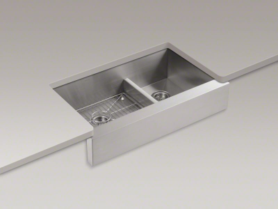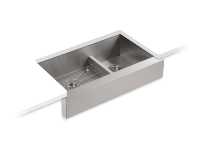 Handcrafted from stainless steel, KOHLER® Vault™ brings bold new style to the traditional farmhouse sink. Tightly angled corners maximize basin space, and a lowered divider offers freedom of movement between basins. Due to its shortened apron, this sink does not require a special apron-front cabinet, making it easy to install with most new or existing 36" cabinetry. The Self-Trimming® design requires only a simple rough cut, overlapping the cabinet face for beautiful results.