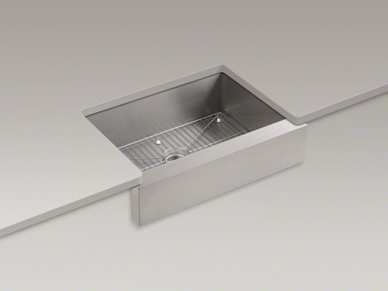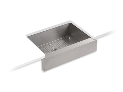 Handcrafted from stainless steel, KOHLER® Vault™ brings bold new style to the traditional farmhouse sink. The single-bowl design features tightly angled corners to maximize bowl space. Due to its shortened apron, this sink does not require a special apron-front cabinet, making it easy to install with most new or existing 30" cabinetry. The Self-Trimming® design requires only a simple rough cut, overlapping the cabinet face for beautiful results.