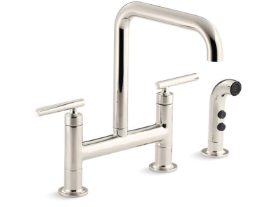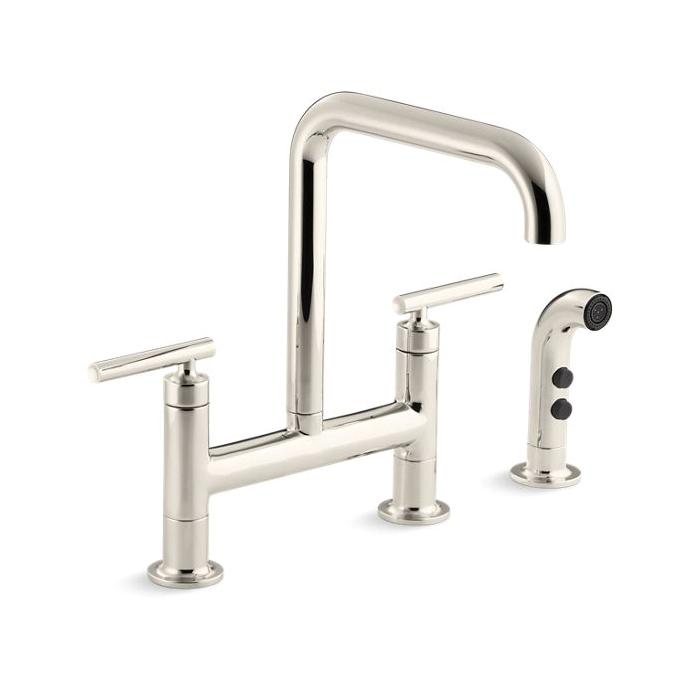 Kohler® Bridge Kitchen Sink Faucet, Purist®, 1.8 gpm, 8 in Center Distance, High-Arc Spout, 8-3/8 in Spout Reach, 10 in Spout Height, Lever, 2 Handles, Side Spray(Y/N): Yes, 3 Faucet Holes, 3/8 in, Compression, 2-1/2 in Maximum Deck Thickness, Deck Mount, Ceramic Disc Valve/Cartridge, 12-1/2 in H, Metal, Vibrant® Polished Nickel