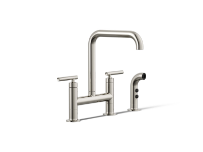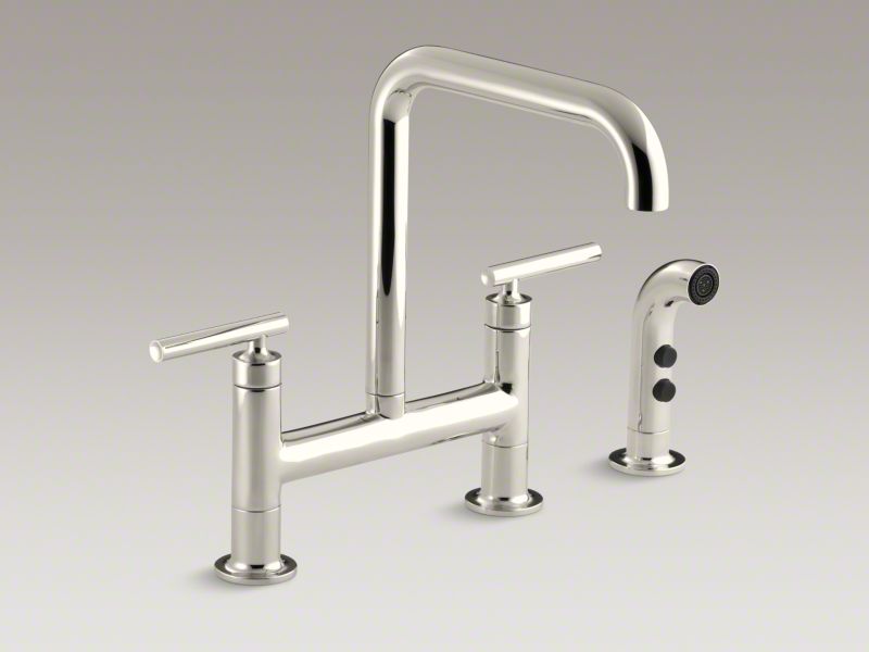 Pairing a classic bridge design with bold new touches, this KOHLER® Purist kitchen faucet combines distinctive modern style and easy-to-use features. The high-arch deck-mount bridge faucet spout provides 10 inches of clearance and rotates 360 degrees, making way for your largest pots and pans. Extended lever handles offer plenty of grip area.