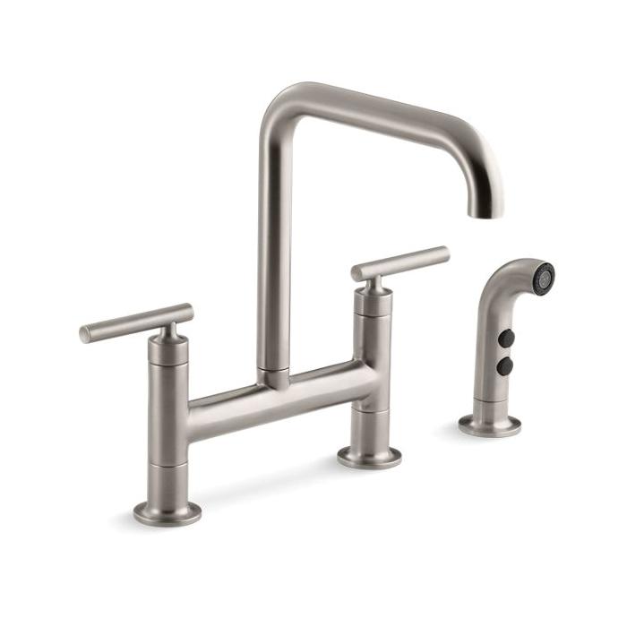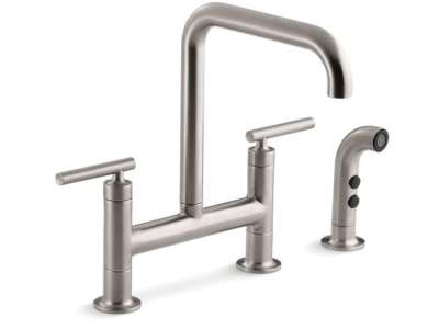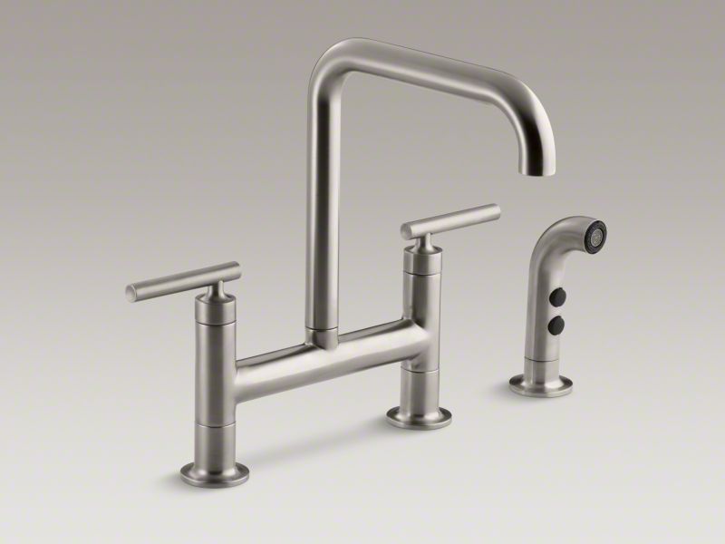 Pairing a classic bridge design with bold new touches, this KOHLER® Purist kitchen faucet combines distinctive modern style and easy-to-use features. The high-arch deck-mount bridge faucet spout provides 10 inches of clearance and rotates 360 degrees, making way for your largest pots and pans. Extended lever handles offer plenty of grip area.