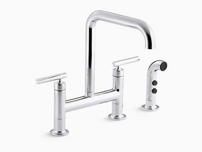 Pairing a classic bridge design with bold new touches, this Purist kitchen faucet combines distinctive modern style and easy-to-use features. The high-arch spout provides 10 inches of clearance and rotates 360 degrees, making way for your largest pots and pans. Extended lever handles offer plenty of grip area.