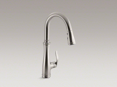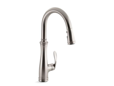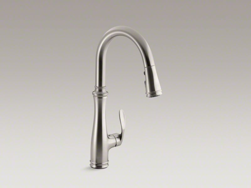 With its sleek look and innovative features, this KOHLER® Bellera pull-down kitchen faucet combines an elegant, versatile design with exceptional ergonomics and functionality. The high-arch deck-mount kitchen faucet spout rotates 360 degrees and reaches over the tallest pots, while the compact, three-function sprayhead pulls down into the sink for up-close tasks, or out of the sink to fill pots. Sweep spray creates a wide, forceful blade of water for superior cleaning. Kohler's docking system, DockNetik, secures the pull-down sprayhead to the spout.