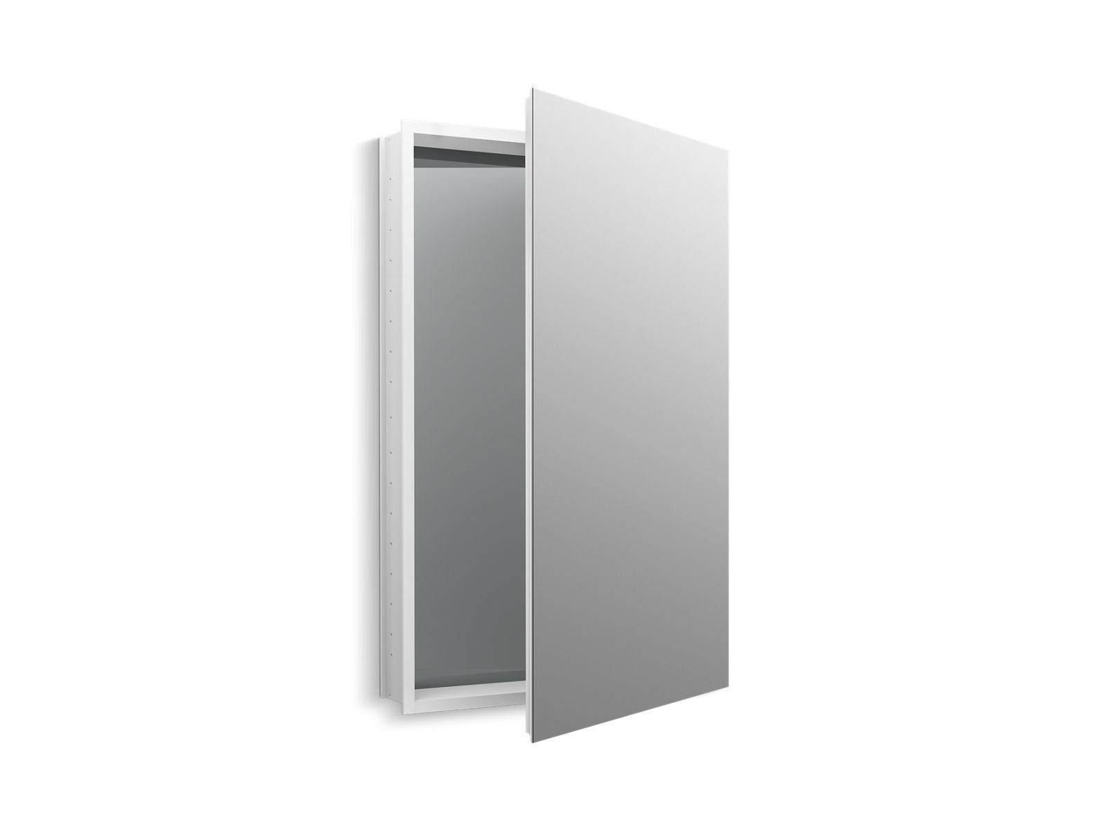 The KOHLER® Catalan 24-1/8" x 36-1/8" mirrored surface-mount/recessed rectangular medicine cabinet provides a stylish complement to any bathroom. Mirrors are positioned on the front and back of the door as well as the interior back wall of the cabinet. Four adjustable, black-tinted glass shelves hold your toiletries and bath items. Durable aluminum construction makes this cabinet rust- and rot-resistant.
