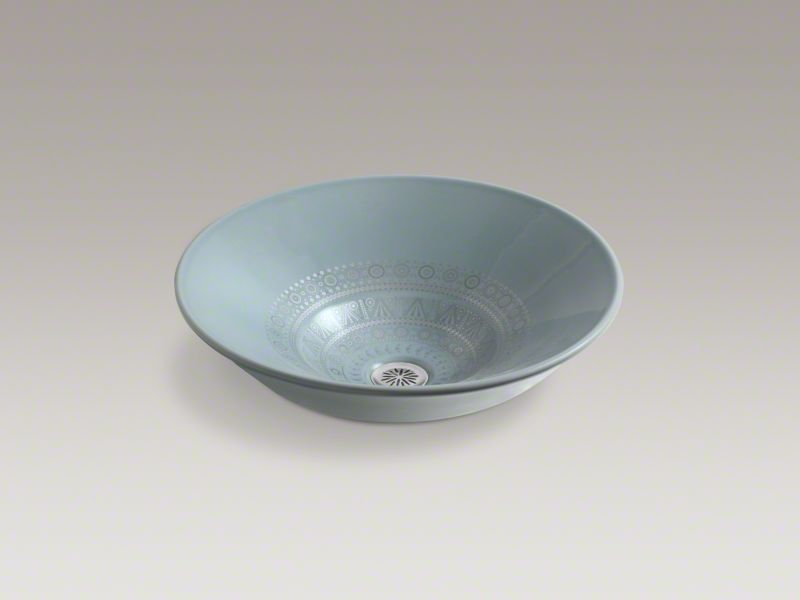 With its unique shape, South Asian detailing, and tone-on-tone effect, the Caravan Collection Nepal sink makes an artistic statement. Its design draws on Henna ceremonies and textile techniques to add a distinctive touch to any bathroom. Delicate detailing and gentle shifts in tone and color gracefully reveal intricate patternwork. The Translucent Blue background gives the pattern a calming effect while enhancing the tone-on-tone quality.
