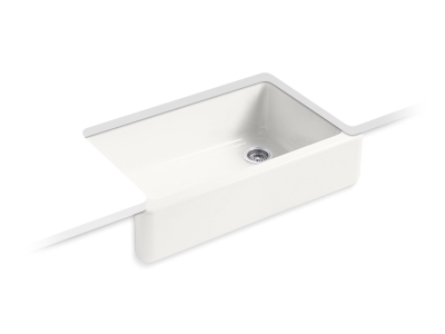 The KOHLER® Whitehaven apron-front kitchen sink features a streamlined and versatile farmhouse style to complement any decor. A large single basin accommodates large pots and pans, while the sloped bottom helps with draining and cleanup. Crafted from enameled cast iron, this sink resists chipping, cracking, or burning for years of beauty and reliable performance. A standard apron front makes it easy to install on 36-inch apron-front cabinetry. The Self-Trimming® design requires only a simple rough cut, overlapping the cabinet face for beautiful results.