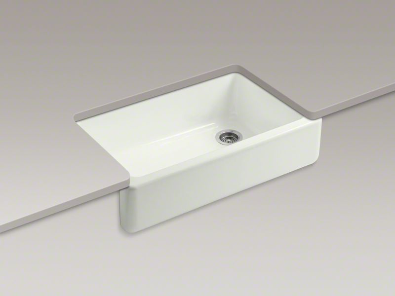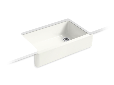 The KOHLER® Whitehaven apron-front kitchen sink features a streamlined and versatile farmhouse style to complement any decor. A large single basin accommodates large pots and pans, while the sloped bottom helps with draining and cleanup. Crafted from enameled cast iron, this sink resists chipping, cracking, or burning for years of beauty and reliable performance. A standard apron front makes it easy to install on 36-inch apron-front cabinetry. The Self-Trimming® design requires only a simple rough cut, overlapping the cabinet face for beautiful results.