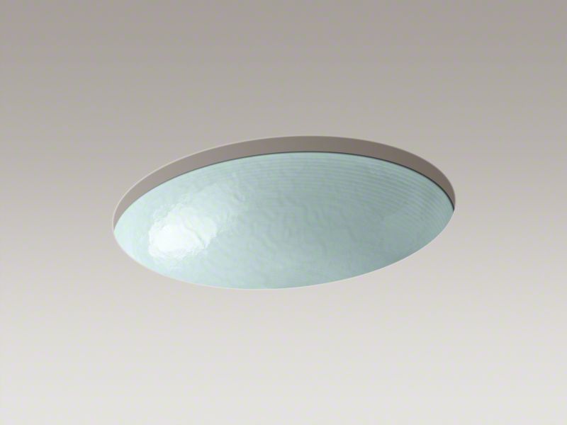 Ideal for creating a dramatic bathroom setting, KOHLER® Whist marries performance and durability with a look that is visually striking. This oval undermount bathroom sink's distinctive glass basin in Dew features a concentric line pattern that gives the feeling of gentle ripples on the surface of a pond.