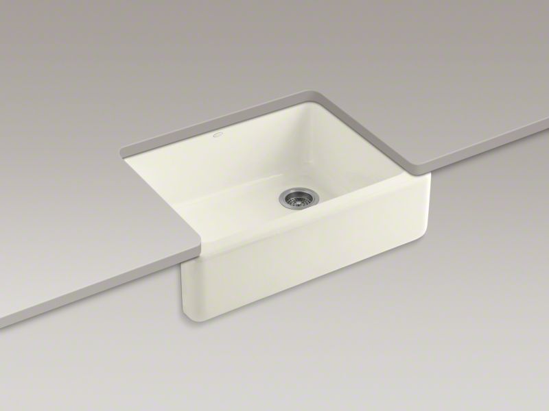 The KOHLER® Whitehaven apron-front kitchen sink features a streamlined and versatile farmhouse style. The Self-Trimming design requires only a simple rough cut, overlapping the cabinet face for beautiful results. The tall integral apron also acts as a drip edge to protect the cabinet from water damage. A large single basin accommodates large pots and pans, while the sloped bottom helps with draining and cleanup. Crafted from enameled cast iron, this sink resists chipping, cracking, or burning for years of beauty and reliable performance.