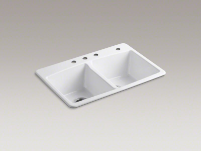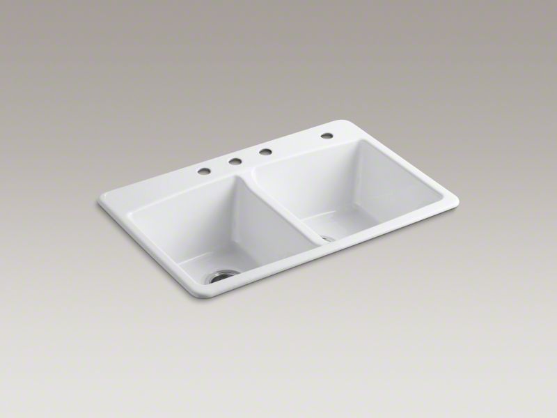 Kohler®, 5846-4-0, Kitchen Sink, Brookfield™ Collection, Rectangular Shape, 14-3/16 in Left, 14-3/16 in Right Bowl Length, 16-1/16 in Left, 16-1/16 in Right Bowl Width, 9 in Left, 9 in Right Bowl Depth, 3-7/8 in Drain Opening, 4 Faucet Holes, 4 in Faucet Hole Spacing, 2 Bowls, 33 in L x 22 in W x 9-5/8 in H Overall, Top Mounting, Enameled Cast Iron, White