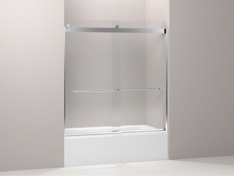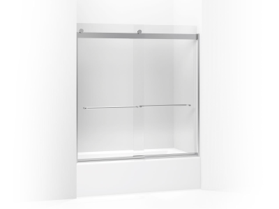 Kohler® Sliding Bath Door, Levity®, 56-5/8 to 59-5/8 in Opening Width, 54-7/8 in Opening Height, Frameless, Clear Tempered Glass, 1/4 in Glass Thickness, 62 in Overall Height, 59-5/8 in Overall Width, 24-9/16 to 27-9/16 in Walk Through, Anodized Aluminum, Bright Silver