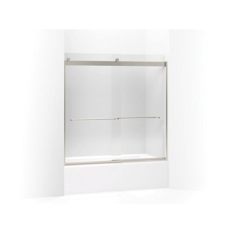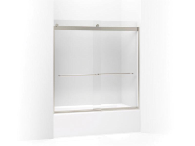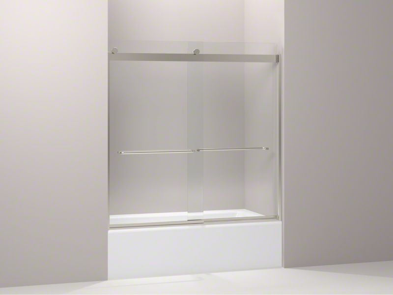 Kohler® Sliding Bath Door, Levity®, 56-5/8 to 59-5/8 in Opening Width, 51-5/8 in Opening Height, Frameless, Clear Tempered Glass, 1/4 in Glass Thickness, 59-3/4 in Overall Height, 59-5/8 in Overall Width, 24-9/16 to 27-9/16 in Walk Through, Anodized Aluminum, Matte Nickel