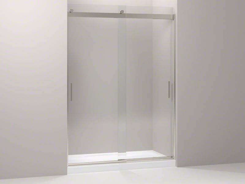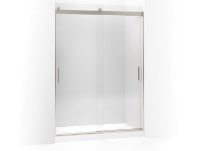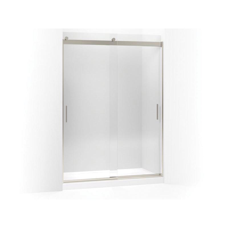 Kohler® Sliding Shower Door, Levity®, 56-5/8 to 59-5/8 in Opening Width, 74-15/16 in Opening Height, Frameless, Crystal Clear Tempered Glass, 3/8 in Glass Thickness, 82 in Overall Height, 59-5/8 in Overall Width, 24-9/16 to 27-9/16 in Walk Through, Vertical Blade, Anodized Aluminum, Brushed Nickel