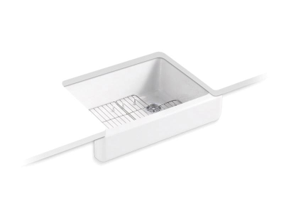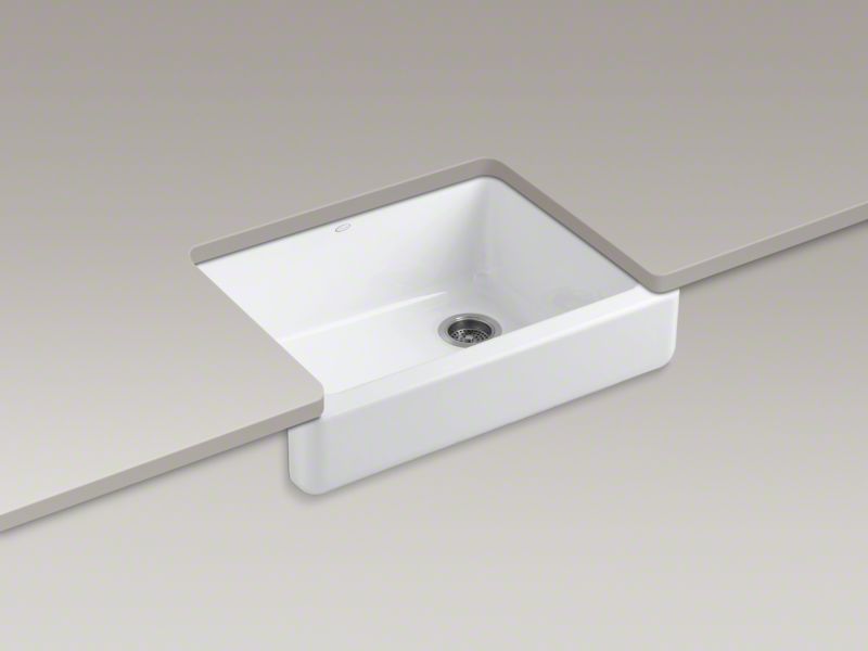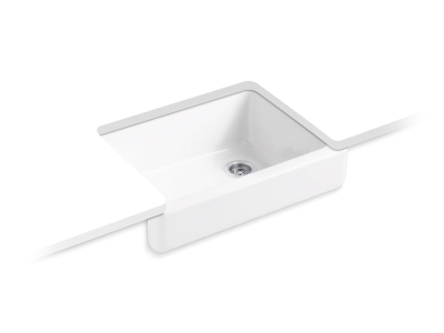 The KOHLER® Whitehaven apron-front kitchen sink features a streamlined and versatile farmhouse style. Perfect for remodeling projects, the Self-Trimming design requires only a rough cut to new or existing 30-inch standard cabinetry for simple installation and beautiful results. A large single basin accommodates large pots and pans, while the sloped bottom helps with draining and cleanup. Crafted from enameled cast iron, this sink resists chipping, cracking, or burning for years of beauty and reliable performance.