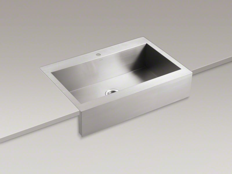 The Vault apron-front kitchen sink combines the sleek, modern look of stainless steel with the traditional farmhouse style. Made to seamlessly coordinate with a variety of decors, this sink features a single bowl with tightly angled corners to maximize basin space, and a top-mount design for easy installation and use on most laminate countertops. Vault's ultra-flat rim makes it easy to wipe from the counter directly into the sink. For added convenience, Vault's shortened Self-Trimming(R) integral apron requires only a rough cut to existing standard cabinetry for beautiful results, making it ideal for remodeling projects.