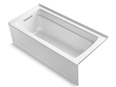 Kohler® Bathtub, Archer®, Soaking Hydrotherapy Bath Therapy, Rectangular, 66 in Length, 32 in Width, 19 in Height, 66 gal Water, Left Drain Location, 1-1/2 in Drain, 50-3/8 x 19-5/8 in Bottom Basin/57-5/16 x 24-1/16 in Top Basin Bathing Well, 15-5/16 in Soaking Depth, 15-5/16 in Overflow Height, 3-Wall Alcove Mount, Acrylic, White