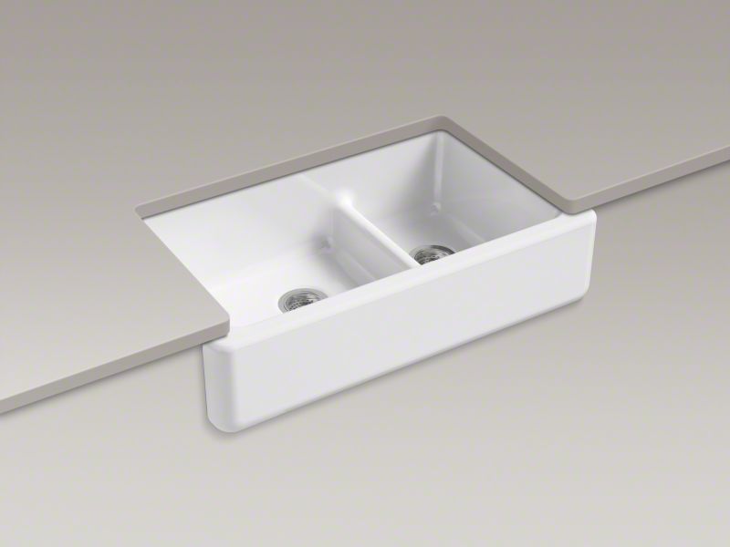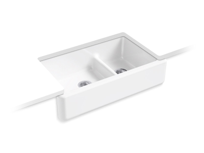 Bring classic farmhouse charm and modern functionality to your kitchen with KOHLER® Whitehaven, an apron-front double-bowl kitchen sink that elevates any space. The Self-Trimming® design simplifies installation by overlapping the cabinet face, creating a seamless, professional look. Crafted from durable enameled cast iron, Whitehaven resists chipping, cracking, and burning for years of lasting beauty. The innovative Smart Divide® feature offers a low-profile barrier between bowls, making it easy to handle large cookware while keeping compartments separate. Designed to fit most standard 36" apron-front cabinetry, this sink blends timeless style with everyday convenience.