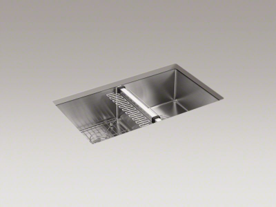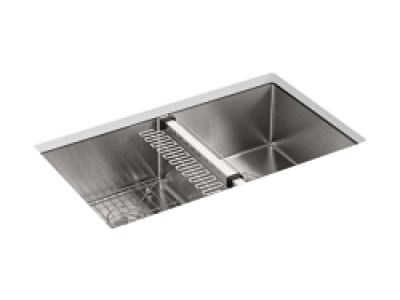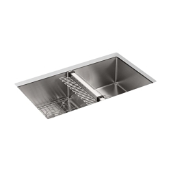 This KOHLER® Strive kitchen sink offers professional style with easy-to-clean curved corners. Made of thick, premium quality 16-gauge stainless steel, the double basin features a sound-absorption system that significantly reduces disposal and dishwashing noise. Two deep bowls allow you to soak and clean large cookware and bakeware. This undermount kitchen sink includes a divider dishcloth bar, a divider utility shelf for scrubbers and sponges, and a bottom sink rack to help prevent scratches.