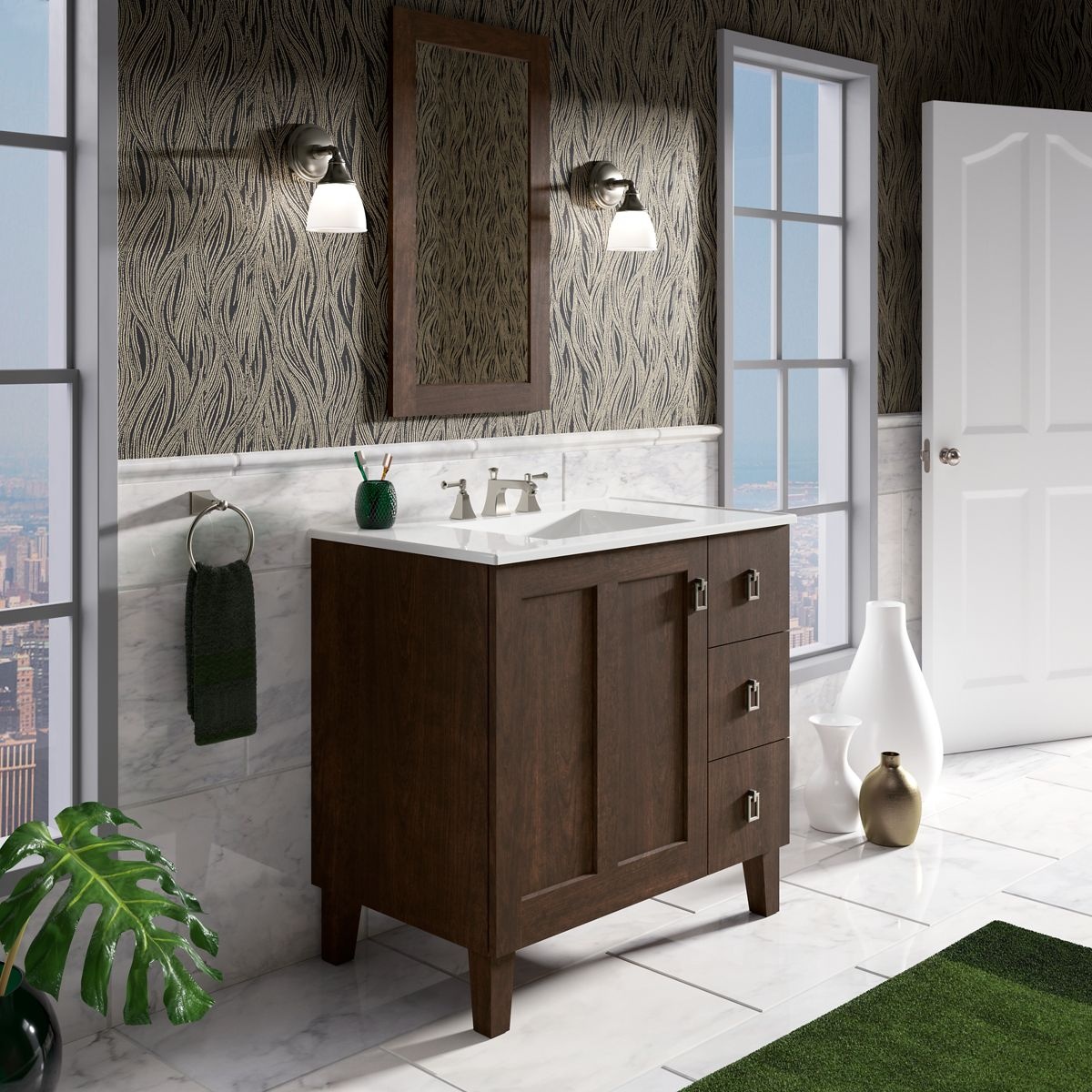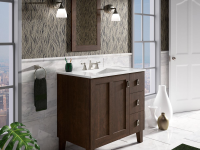 Breathtaking design meets unrivaled craftsmanship. No detail was overlooked in the meticulous crafting of this collection, from the premium hardwoods to the specially designed hardware and vanity tops, all available in an array of finishes to create your own look. This KOHLER® Poplin vanity cabinet draws its inspiration from Craftsman and Shaker furniture designs and features a prominent wood grain for a robust, rustic feel. Complete your 36" freestanding single sink vanity with a coordinating top, hardware, and accessories from the collection.