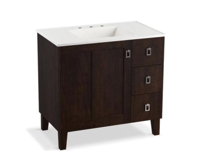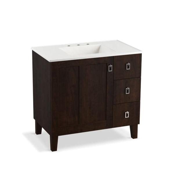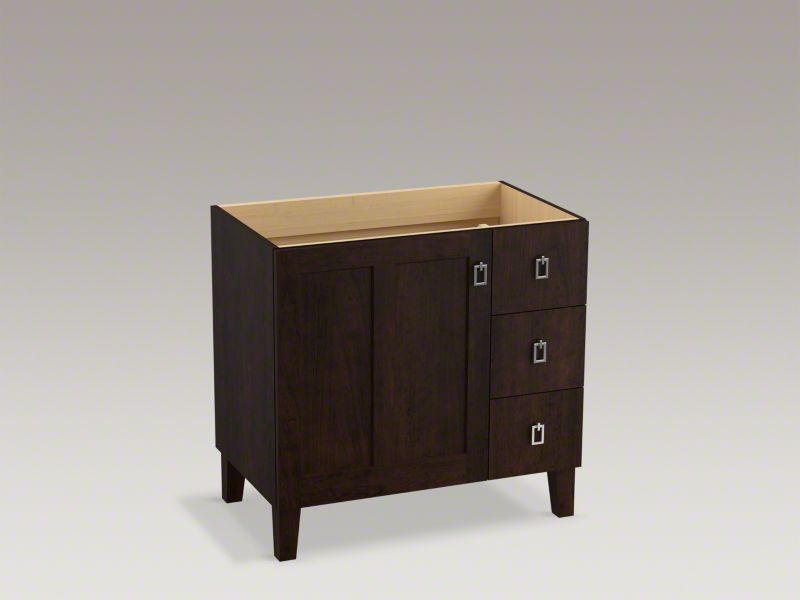 Kohler® Bathroom Vanity Cabinet, Standard, Poplin®, 34-1/2 in Overall Height, 36 in Overall Width, 21-7/8 in Overall Depth, Floor Mount, Solid Wood/Veneer Cabinet, Claret Suede Cabinet, 1 Doors, 3 Drawers