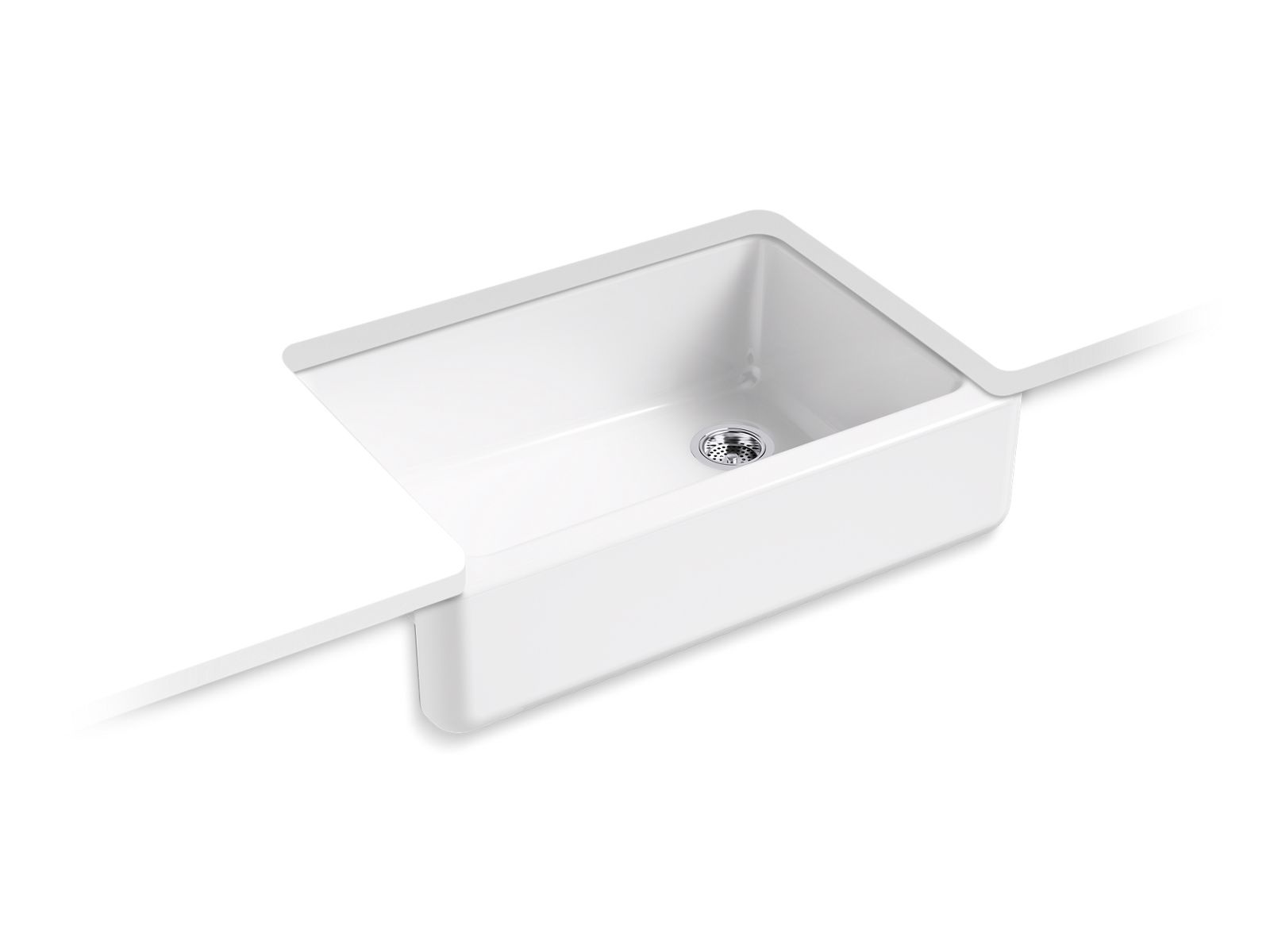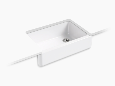 The KOHLER® Whitehaven apron-front kitchen sink features a streamlined and versatile farmhouse style to complement any decor. A large single basin accommodates large pots and pans, while the sloped bottom helps with draining and cleanup. Crafted from enameled cast iron, this sink resists chipping, cracking, or burning for years of beauty and reliable performance. A standard apron front makes it easy to install on 33-inch apron-front cabinetry. The Self-Trimming® design requires only a simple rough cut, overlapping the cabinet face for beautiful results.