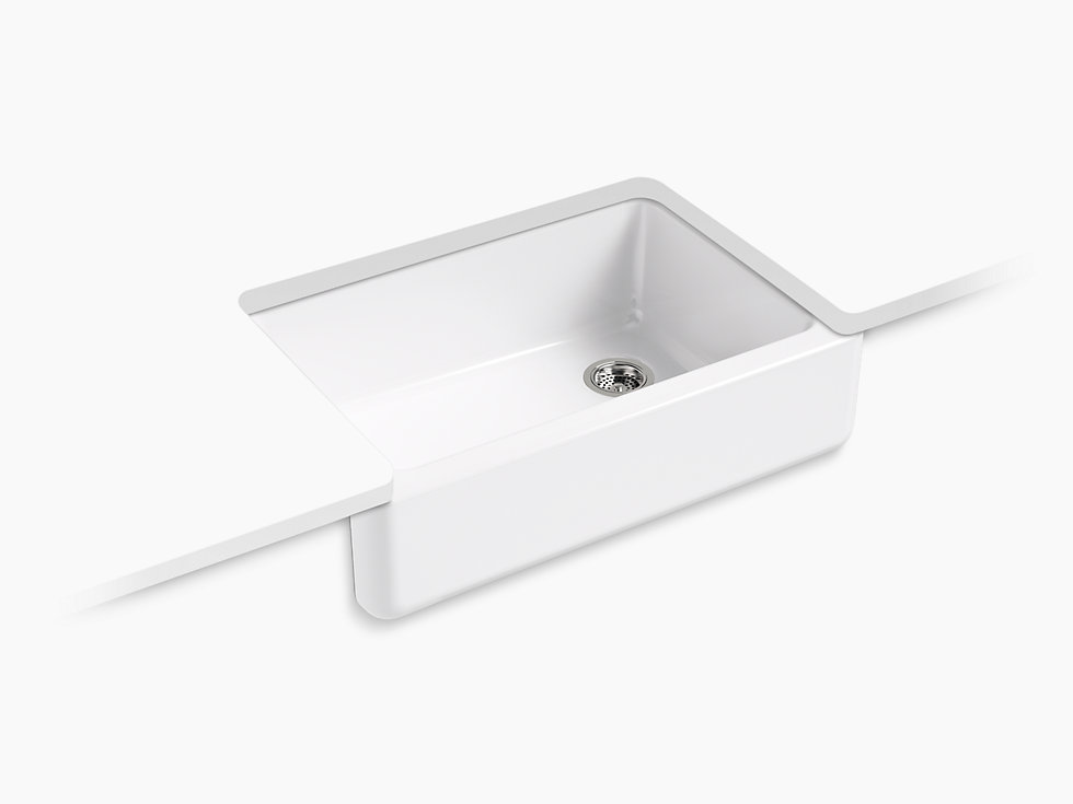 Kohler® 5827-0 Whitehaven® Self-Trimming Kitchen Sink With Tall Apron, Rectangular Shape, 32-11/16 in W x 9-5/8 in D x 21-9/16 in H, Reinforced Base Mount, Enameled Cast Iron, White
