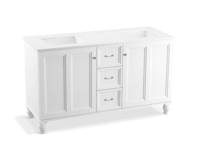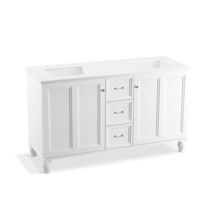 Kohler® Bathroom Vanity Cabinet, Standard, Damask®, 34-1/2 in Overall Height, 60 in Overall Width, 21-7/8 in Overall Depth, Floor Mount, Solid Wood/Veneer Cabinet, Linen White Cabinet, 2 Doors, 3 Drawers